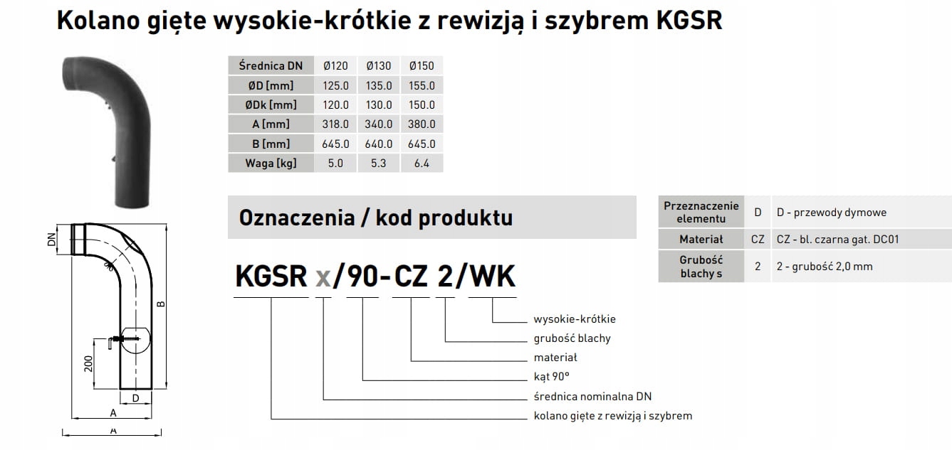 Kolano kominowe gięte fi 150 wysokie / krótkie / z szybrem / z rewizją SPK
