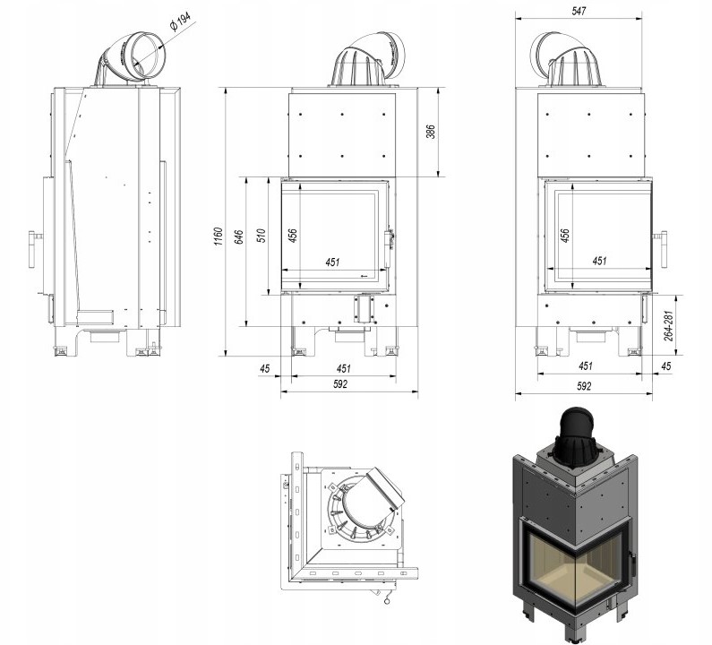 Kominek powietrzny stalowy KRATKI MBN lewy BS 8 kW Ø 200