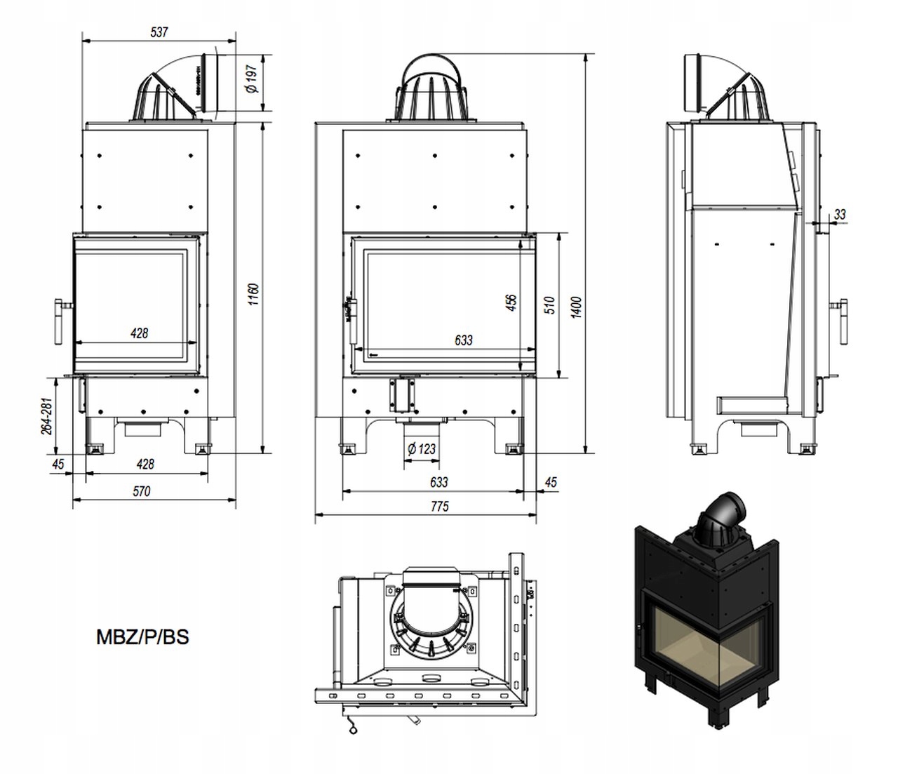 Kominek powietrzny stalowy KRATKI MBZ prawy BS 13 kW Ø 200