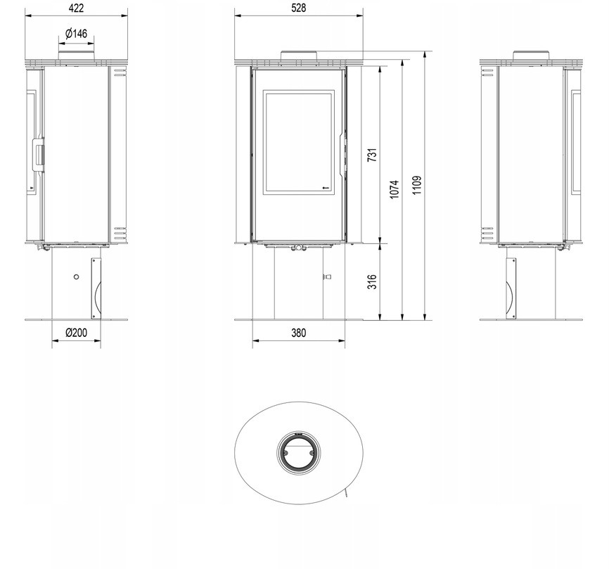 Piec stalowy kaflowy koza obrotowy AB S/N/O/DR/GLASS Ø 150 8 kW czarny