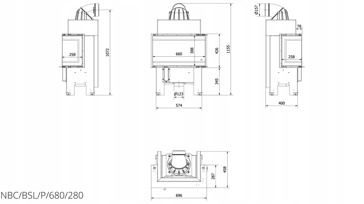 Wkład kominkowy NBC 680/280 lewy prawy 7 kW Ø 160 TRÓJSTRONNE PRZESZKLENIE